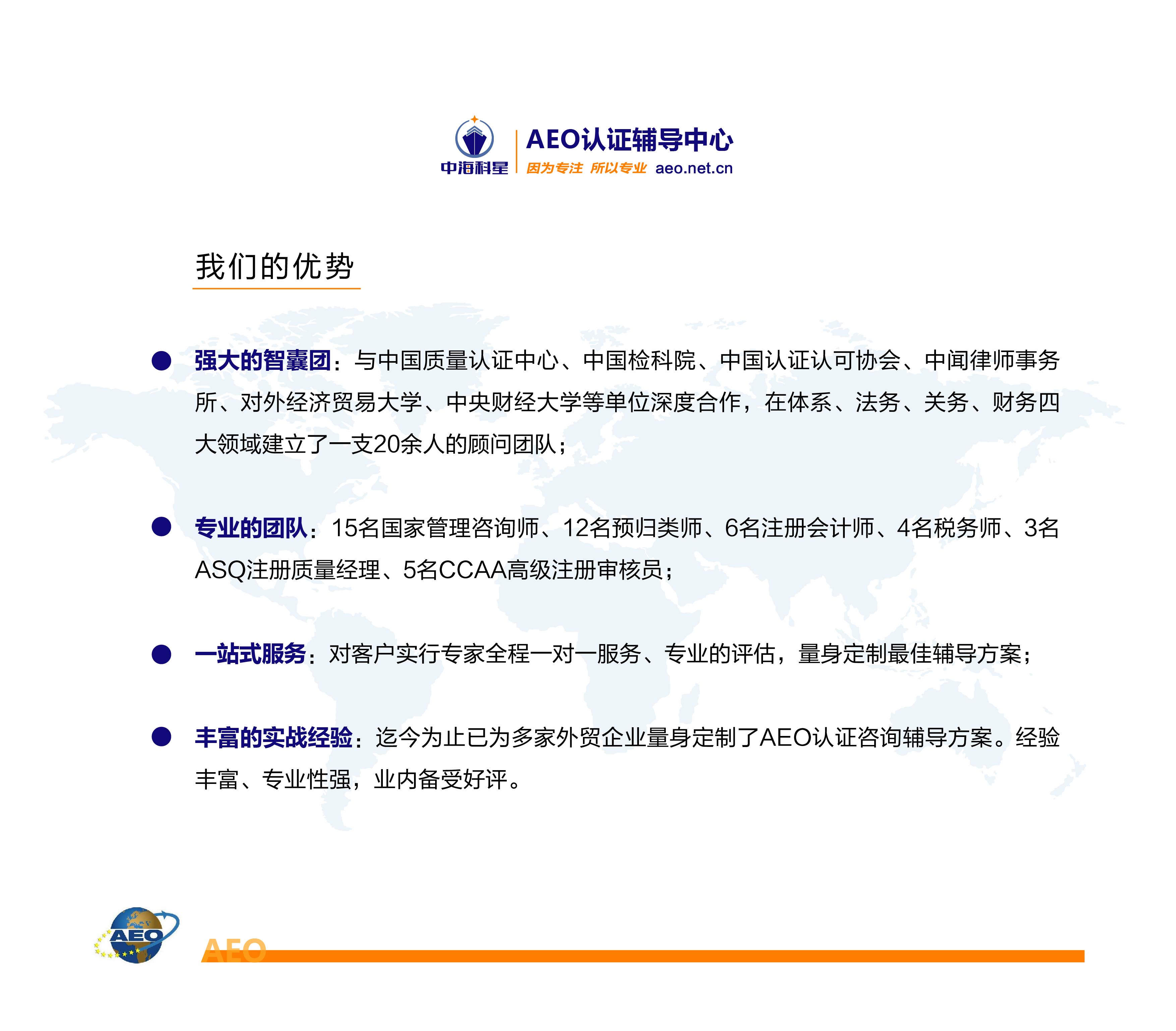 AEO专业辅导机构,为每家企业量身定制AEO认证辅导方案,专业解决企业制度落地执行的问题,愿企业AEO认证中一次性顺利通过考试!