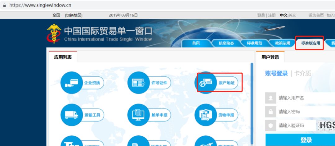 点击门户网站“标准版应用”页签,选择原产地证中的原产地证书自助打印系统,进入“单一窗口”标准版登录界面(如下图)。