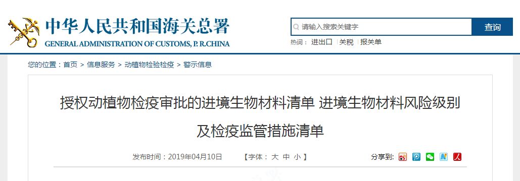海关总署公布授权动植物检疫审批的进境生物材料有关清单