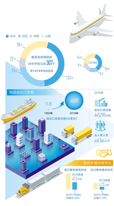 1950年,我国进出口贸易总额仅有11.35亿美元;1978年,我国进出口贸易总额206.4亿美元,进出口货运量7033万吨,出入境人员566万人次;而到2018年,我国进出口贸易总额达4.62万亿美元,进出口货运量445290万吨,出入境人员达6.5亿人次,口岸开放为我国成为世界货物贸易第一大国做出了应有的贡献。