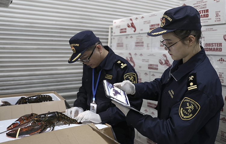 波士顿龙虾学名叫美洲鳌龙虾,生活于寒冷海域,因其富含各种微量元素,味道鲜美而深受消费者喜爱。活体水产由于其个体处于存活状态,肉质鲜美,能最大限度的保存水产品的鲜美特性,但鲜活龙虾对时效要求很高。为保障龙虾品质,杭州海关所属杭州萧山机场海关关员第一时间实施现场查验,运用“移动单兵查验设备”等科技设备完成货证核查后,立刻套上无菌手套抓取龙虾开展现场感官检疫、检验抽样等程序,确保这批“生猛”活龙虾在国门生物安全和食品安全的前提下高效快速通关,全程仅用58分钟。