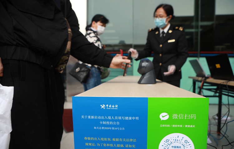 目前,珠海各口岸均已全面实施出入境人员健康申报。旅客可现场填写纸质健康申明卡或提前使用中国海关微信小程序进行网上申报。拱北海关在各口岸设置有专门的健康申报区,通过提前派发健康申明卡、张贴填写示例及中国海关微信小程序二维码,加派人力支援旅检现场开展体温监测、健康申明卡收发、核查,积极优化和推广网上健康申报等工作,提升旅客通关效率。