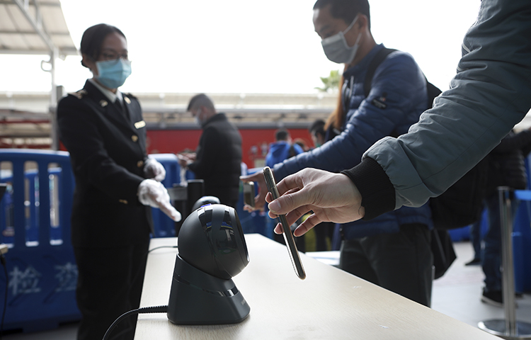图为:拱北口岸出境旅客有序出示健康申报结果二维码进行验核 俞波/摄
