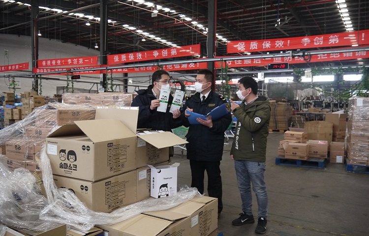 图为:海关关员到跨境电商仓库了解企业复工情况 程井泉/摄