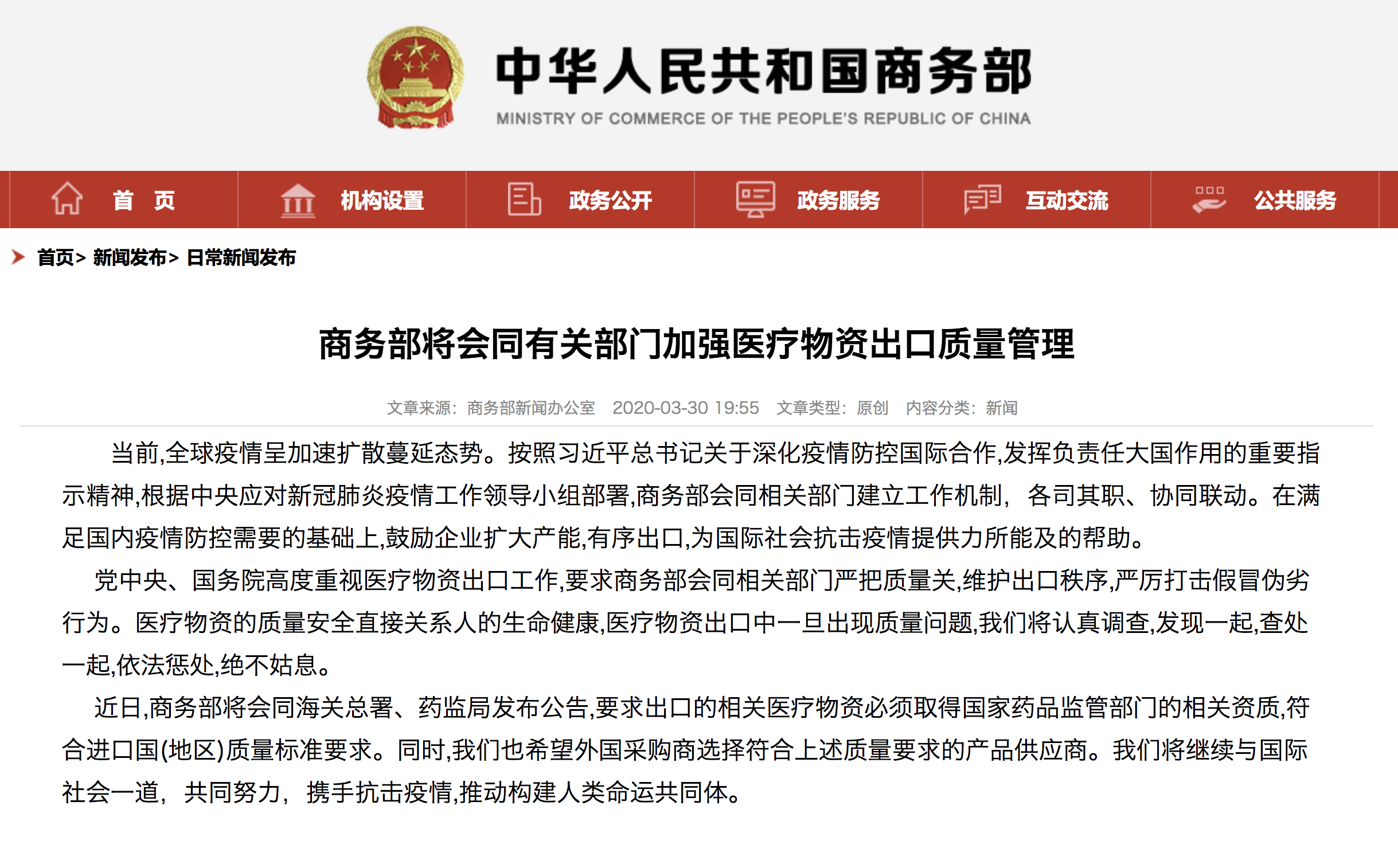 近日,商务部将会同海关总署、药监局发布公告,要求出口的相关医疗物资必须取得国家药品监管部门的相关资质,符合进口国(地区)质量标准要求。同时,我们也希望外国采购商选择符合上述质量要求的产品供应商。我们将继续与国际社会一道,共同努力,携手抗击疫情,推动构建人类命运共同体。
