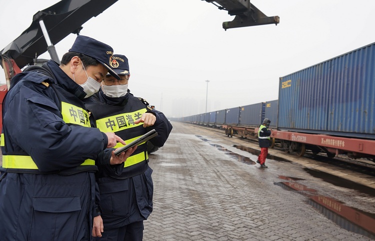 图为:海关关员在现场监管班列集装箱装运 刘秀丽/摄