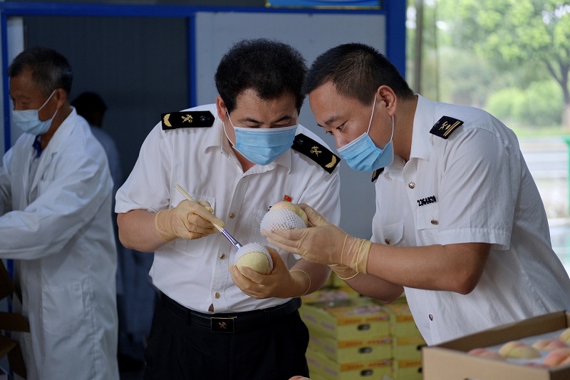 图为:南京海关所属宜兴海关关员在装箱现场对水蜜桃进行检疫 陈超 摄 7月14日,宜兴首批出口水蜜桃在香港上架销售。据了解,这批出口水 ...